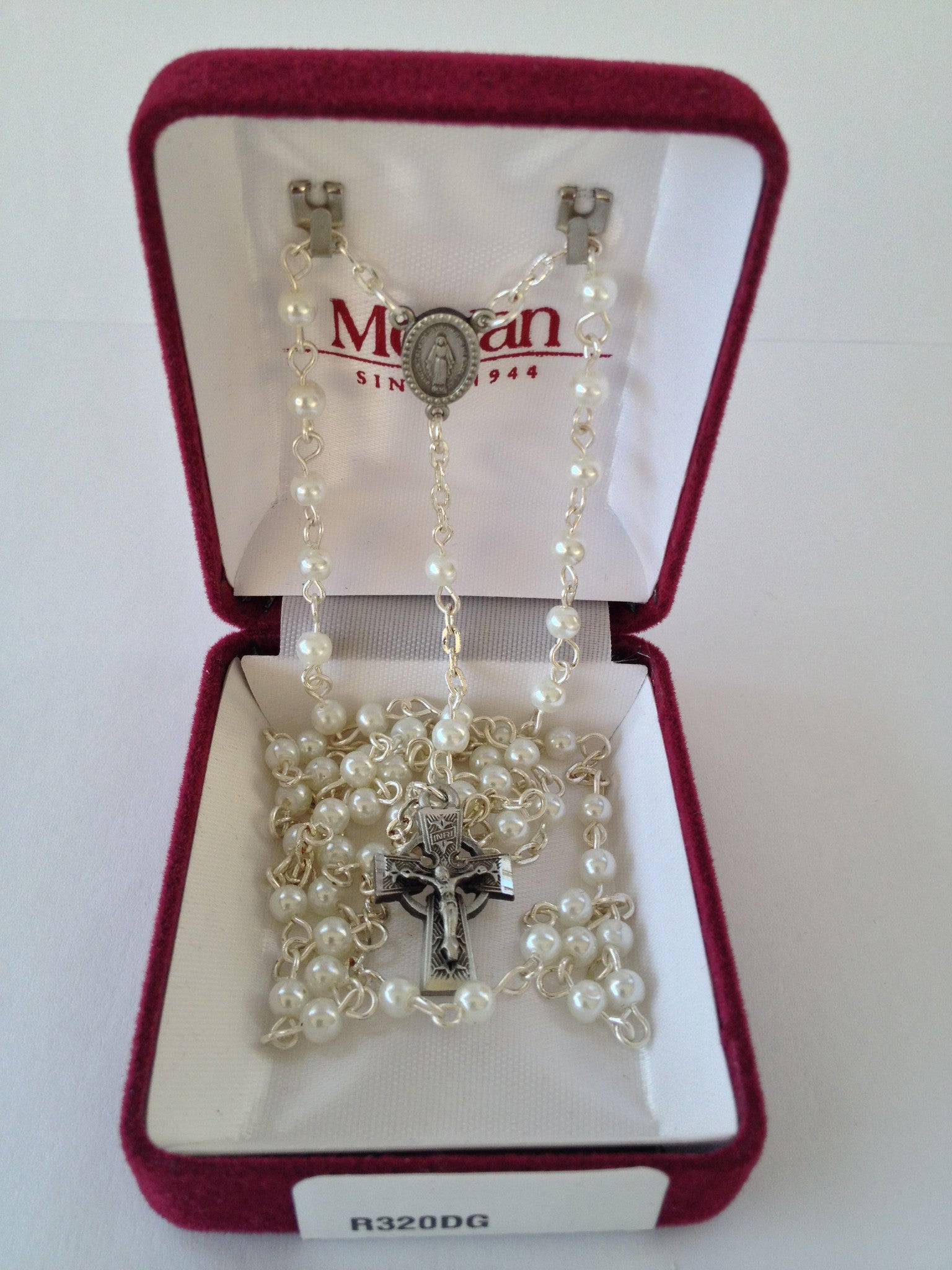 A small engraved rosary hung on a string of pearls--a lovely and timeless gift.