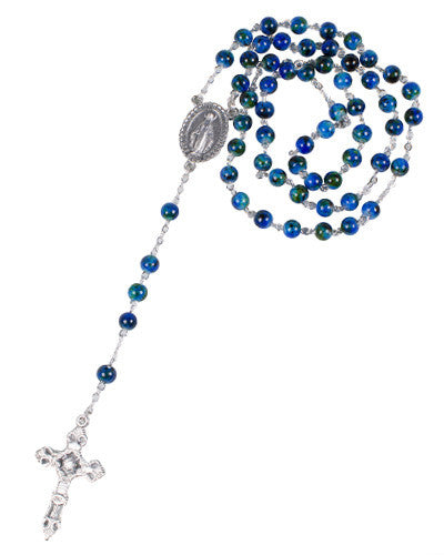 Marble blue fi re polished rosary with the 100th anniversary medal of the apparition of Our Lady of Fatima in 1917.