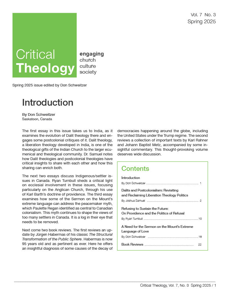 Critical Theology is a quarterly periodical devoted to reflections on religion, society and culture drawn from a theological critique that draws its inspiration from the preferential option for the poor.