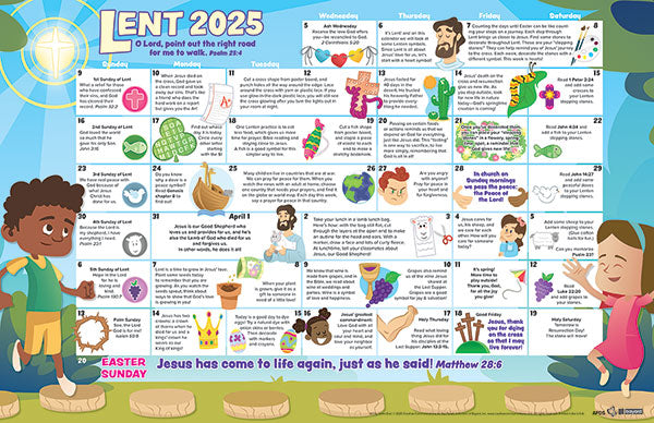 This colorfully illustrated and spiritually enriching single-page calendar is filled with prayers, thought-starters, activities and many suggestions for Bible reading. A step-by-step guide through the season of Lent is featured prominently among these mini meditations.