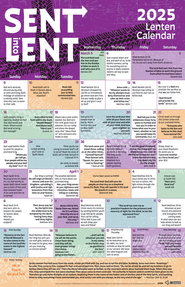 This calendar provides brief spiritual reflections for each day. This calendar provides Biblical examples and calls to action for young people as they follow our Savior, look for chances to serve others and tell the Good News of God’s Love. The teen calendar matches the teen devotional book SNL. Dated material not returnable.