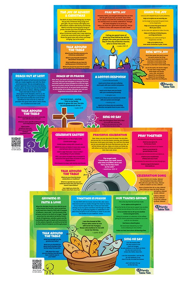 This set of four laminated placemats is designed to be used throughout the Church Year as families gather together in faith around the dinner table. Seasonal and traditional table prayers are provided as well as “Table Talk” discussion starters for faithfilled and fulfilling conversation. Each set includes a placemat for Advent/Christmas, Lent/Easter,