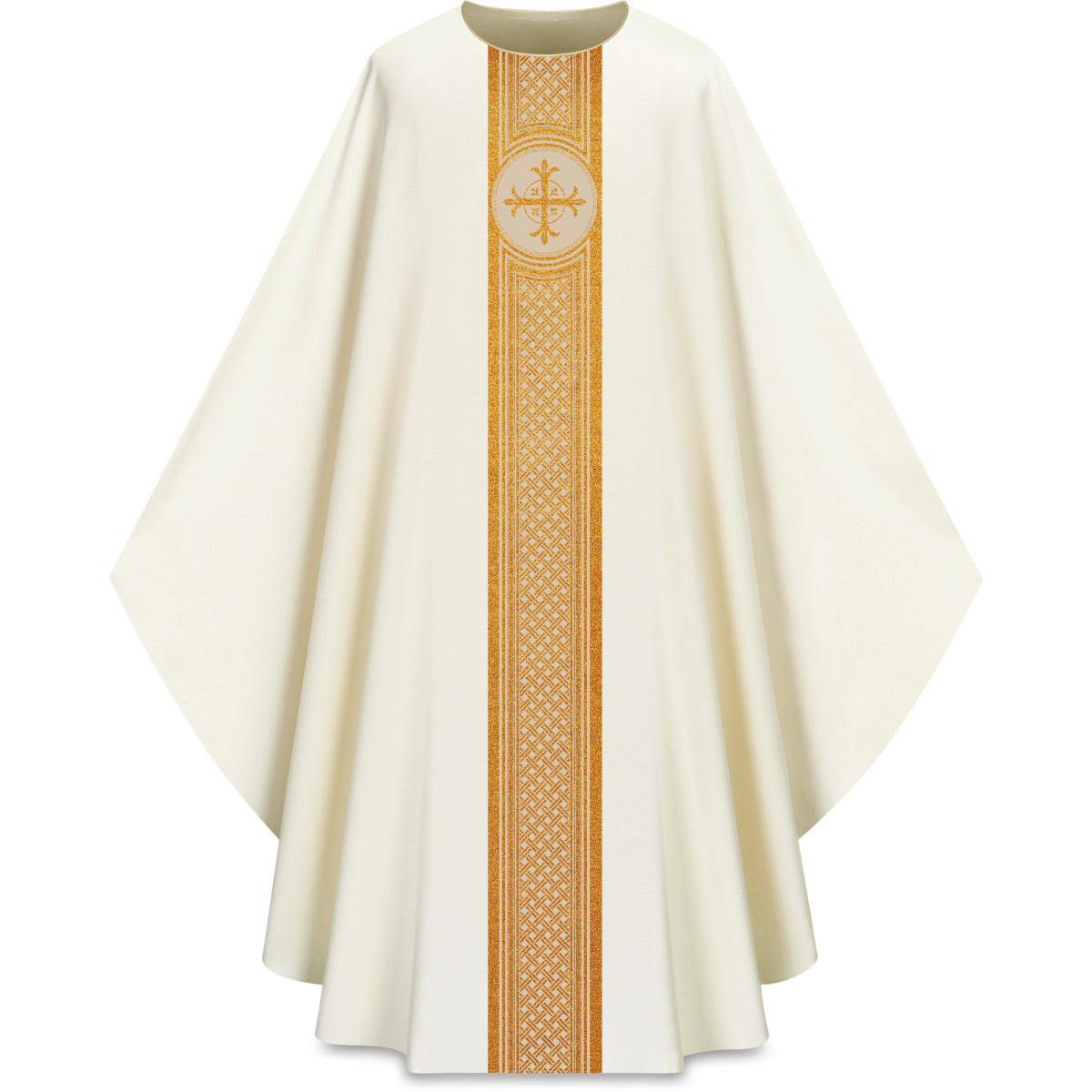 Chasuble made in Elias fabric. In ivory color with gold band. Lenght 52". Small stole included.