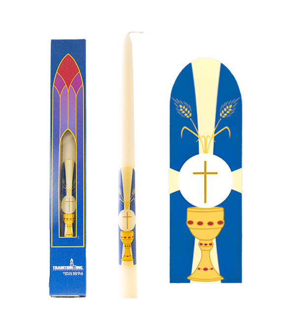 First Communion souvenir candle with Chalice and Host motif. Length 11''. Gift box.